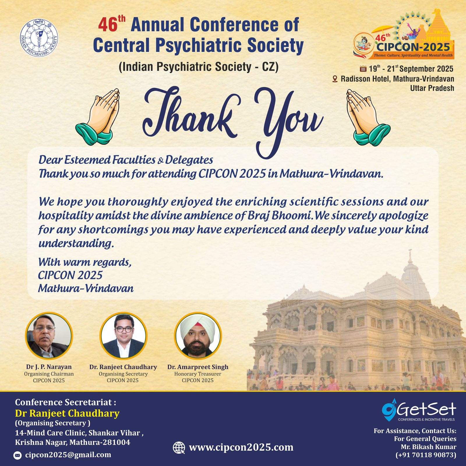 On behalf of the organizing committee, we are delighted to invite you to the 46th Annual Conference of the Central Psychiatric Society (Indian Psychiatric Society-CZ), Organized By The Agra Psychiatric Society. The conference will be held from September 19th to 21st 2025, at Radisson Hotel, Vrindavan, Uttar Pradesh.